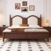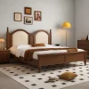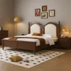 Crafted with timeless style, this wooden bed frame combines a sturdy natural wood structure with a gracefully arched upholstered headboard. The headboard design features paneled details and soft padding, bringing both comfort and elegance to the room. The solid frame is supported by turned wooden legs, ensuring durability and a balanced aesthetic. Its classic silhouette works well with both traditional and transitional interiors.