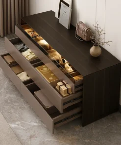 Crafted in a sleek contemporary style, this wooden jewelry armoire offers a spacious and modern solution for organizing accessories and essentials. The clean lines and dark wood finish bring a refined touch, making it suitable for both bedrooms and dressing spaces. The design includes open compartments with display shelving, drawers for smaller items, and side sections for neatly arranged storage. Its generous structure allows it to function as both a jewelry organizer and a compact storage cabinet for folded garments or decorative pieces.