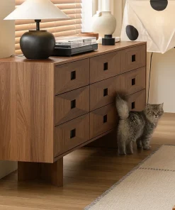 This modern wooden sideboard features a striking geometric wood grain pattern across its nine spacious drawers, making it both functional and artistic. The symmetrical design, paired with recessed square handles, creates a clean and minimal aesthetic that enhances any living room, dining space, or bedroom. Crafted with a durable wooden frame and elevated base, it provides ample storage for clothes, dinnerware, or household essentials while keeping your interior stylishly organized. Its timeless walnut finish makes it a versatile statement piece for both modern and classic decor.