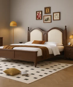 This traditional wooden bed frame features an arched upholstered headboard and solid wood structure, creating a refined centerpiece for the bedroom.