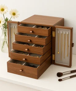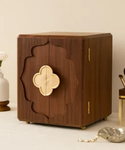 Designed with a timeless traditional style, this wooden jewelry armoire provides an elegant way to store and organize personal accessories. Its compact form allows it to fit neatly on a dresser, vanity, or bedroom table. The armoire features a smooth wood finish with a decorative front and brass-toned hardware. Inside, it includes drawers, necklace hooks, and a cabinet section, offering dedicated spaces for rings, earrings, bracelets, and chains.