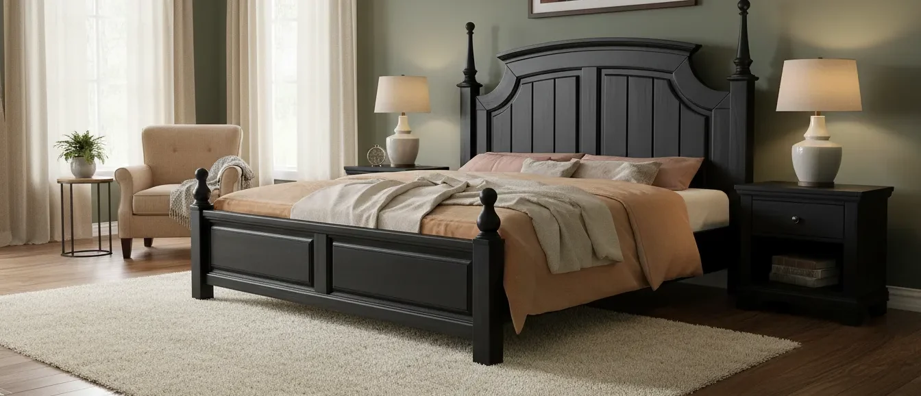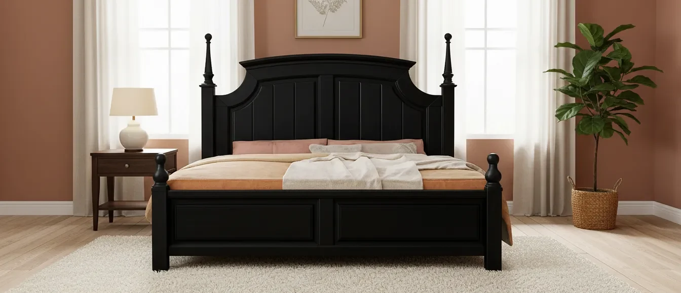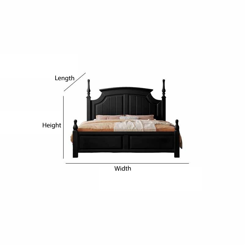 This classic wooden bed stands out with its tall headboard, decorative posts, and paneled design that brings traditional elegance into your home. The black finish enhances its bold character, making it a sophisticated centerpiece for any bedroom. Crafted from durable wood, it combines strength with style, offering both stability and long lasting use. The detailed craftsmanship reflects timeless charm, perfect for those who appreciate classic furniture with a modern touch.