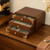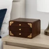 Crafted in a timeless traditional style, this wooden jewelry armoire provides a compact and elegant solution for storing personal accessories. Its smooth rounded edges and brass corner details add a touch of decorative character. The armoire features three drawers designed to organize rings, necklaces, bracelets, and small items. Each drawer is fitted with a rounded knob for easy access, while the compact size makes it suitable for tabletops, dressers, or vanity areas.