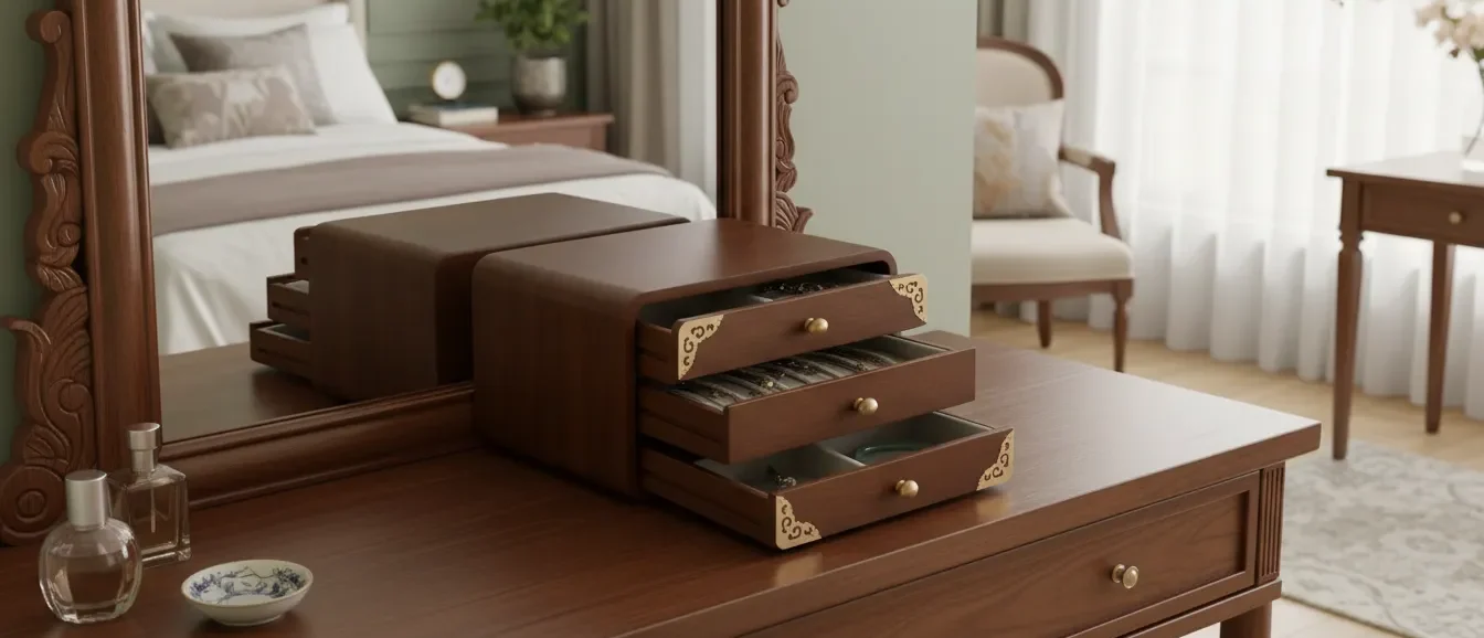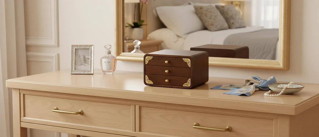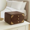 Crafted in a timeless traditional style, this wooden jewelry armoire provides a compact and elegant solution for storing personal accessories. Its smooth rounded edges and brass corner details add a touch of decorative character. The armoire features three drawers designed to organize rings, necklaces, bracelets, and small items. Each drawer is fitted with a rounded knob for easy access, while the compact size makes it suitable for tabletops, dressers, or vanity areas.