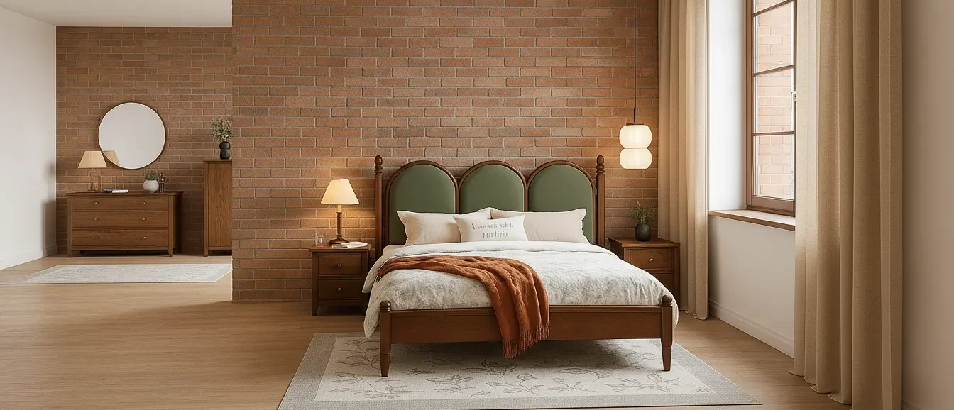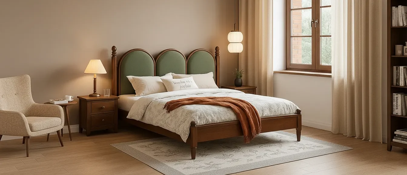 This modern wooden poster bed features a natural wood frame with a soft upholstered headboard, bringing comfort and style to the bedroom.