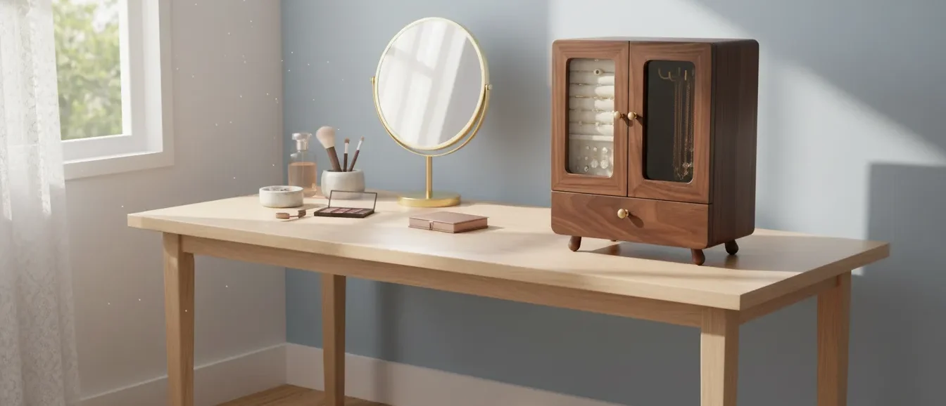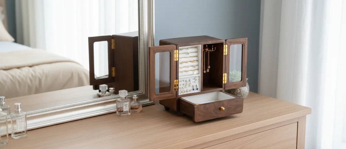 This traditional wooden jewelry armoire features compartment drawers and hooks, offering a practical way to organize and protect your accessories.