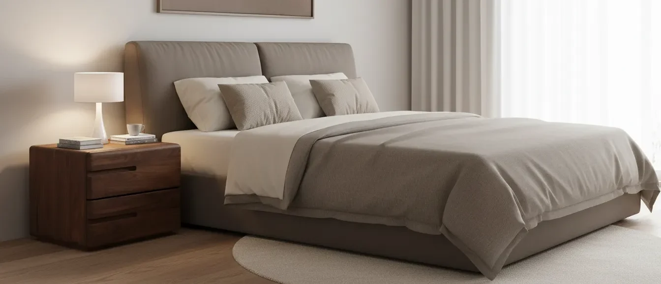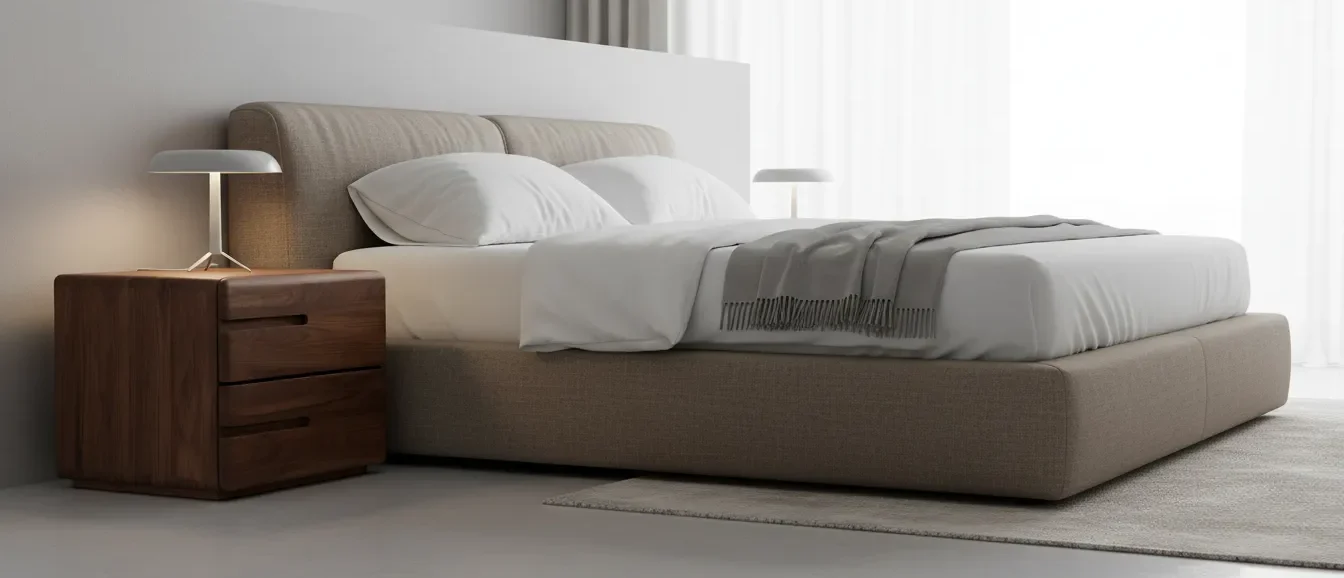 Stylish bedside nightstand with two drawers, rounded edges, and a sleek wooden finish for practical storage and modern appeal.