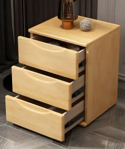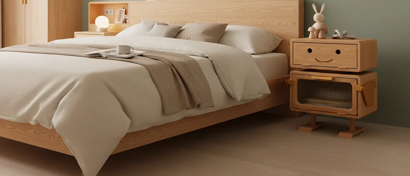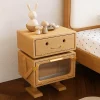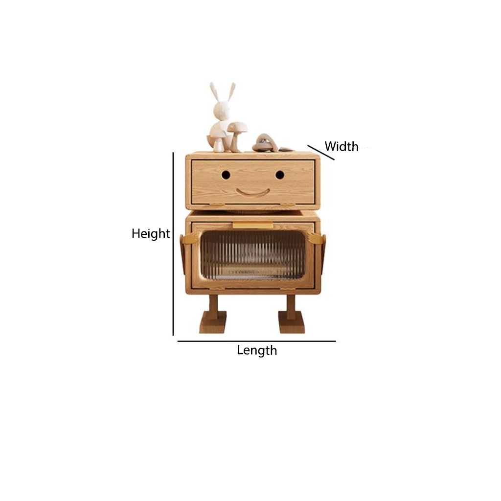 This playful nightstand is crafted from natural wood, designed with a smiley face on the top drawer to bring charm and joy to any child’s bedroom. The lower cabinet features a textured glass door with a golden handle, offering stylish enclosed storage. Sturdy wooden legs and side arms add stability and a unique character.