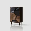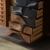 A unique tall dresser with 5 spacious drawers and a striking 3D carved front in wood and black tones, blending art with function.