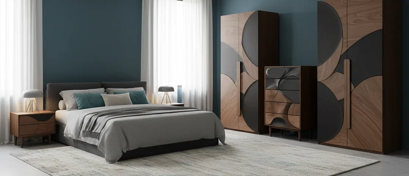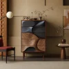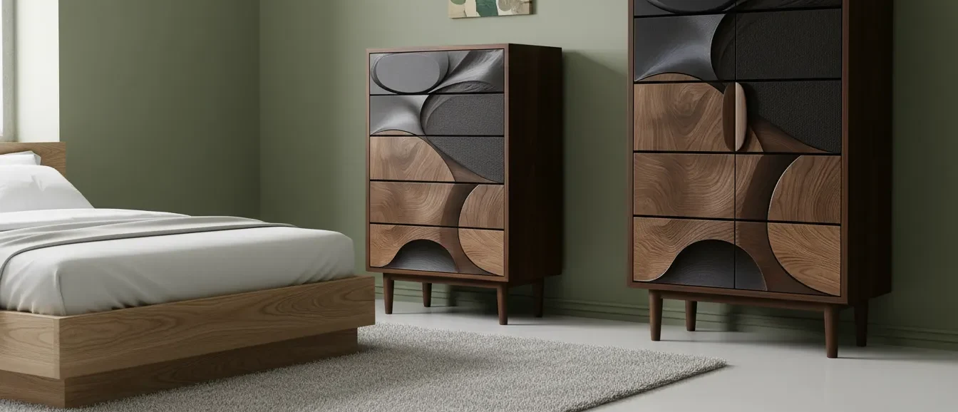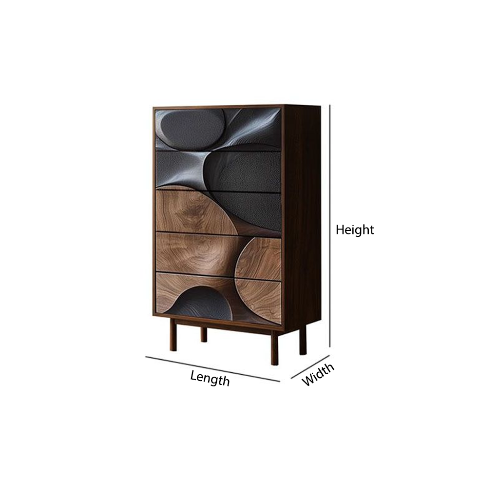 A unique tall dresser with 5 spacious drawers and a striking 3D carved front in wood and black tones, blending art with function.