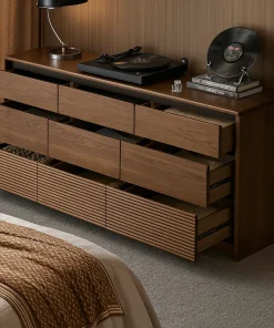 This modern wooden tall dresser is a bold statement piece that combines storage with artistic design. Featuring 5 roomy drawers, it offers ample space for clothing, linens, or personal items while keeping your home neat and stylish. The drawer fronts are adorned with a stunning 3D carved pattern in wood grain and matte black, creating a sculptural and eye-catching effect.