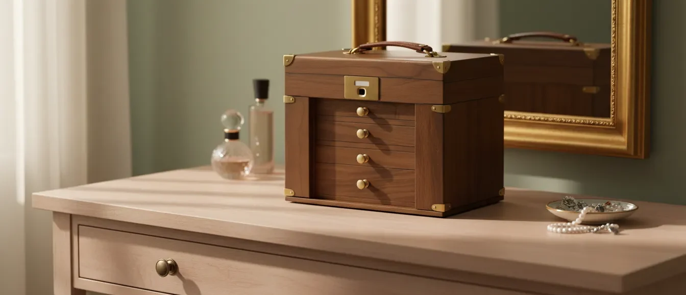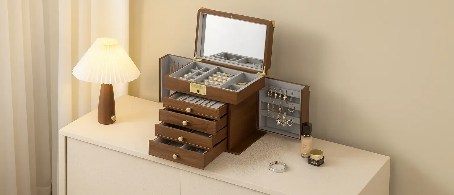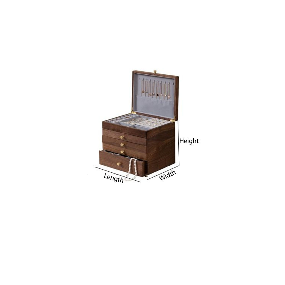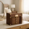 Designed with a classic trunk-style look, this wooden jewelry cabinet provides both style and functionality for organizing personal accessories. Its sturdy form sits neatly on a dresser, vanity or countertop, making it a versatile bedroom addition. The cabinet features multiple exterior drawers for rings, earrings, and bracelets, along with interior compartments and a built-in mirror for added convenience. A secure lock and metal corner accents enhance both protection and durability.