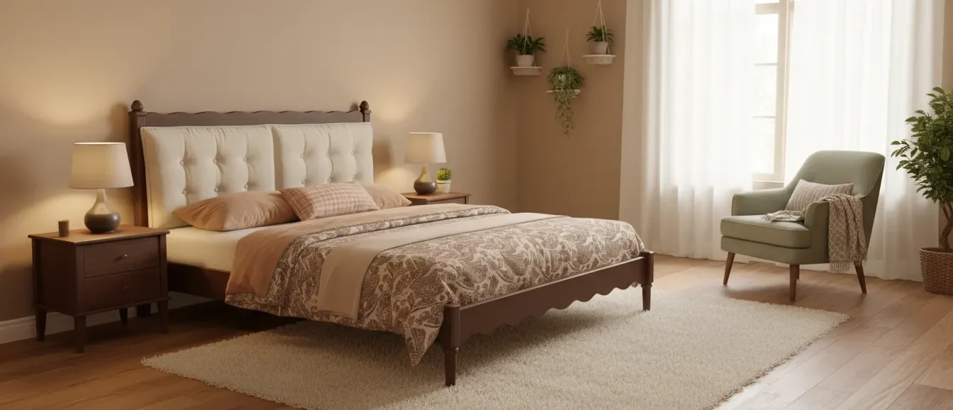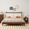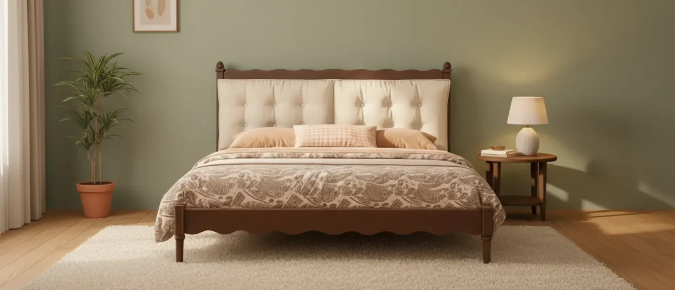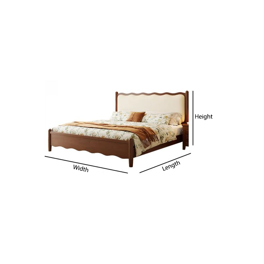 Blending classic craftsmanship with refined details, this wooden platform bed brings a warm and inviting look to the bedroom. The decorative upholstered headboard with stitched accents adds texture and softness, creating a comfortable backdrop for rest. The solid wood frame is designed with subtle carved details and turned posts, giving the piece a traditional character while ensuring stability. Elevated legs keep the bed light in appearance, balancing durability with style.